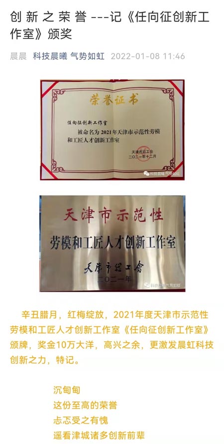 “任向征創新工作室”榮獲天津市“示范性勞模及工匠人才創新工作室”稱號